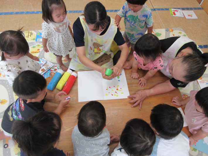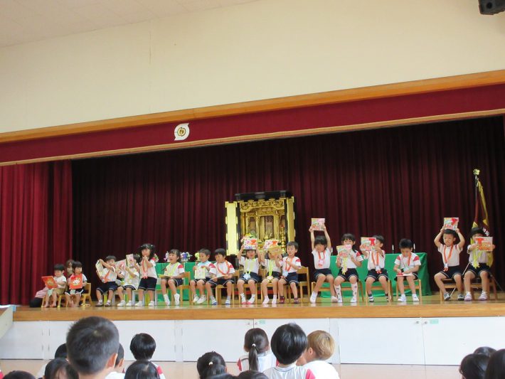 交通安全教室(^^) 2025年09月11日 園ブログ 今日はみんなが楽しみにしていた交通安全教室がありました(*^^*) 子ども達は、ホールに入り信号機を見つけて大興奮! 市役所の方と警察官の方が指導にきてくださり、 お話を聞いたり、DVDを見ました。 月組は横断歩道を渡る練習もしましたよ! 上手に渡れたね! これ… 続きを読む とんぼ製作★ 2025年09月8日 園ブログ 9月の製作でとんぼを作りました! とんぼの羽根をデカルコマニーの技法で かわいく模様を仕上げましたよ(*^^*) 画用紙に絵具をちょんちょんと出し、半分に折って 保育者と一緒に「すりすり~!」と言いながら 画用紙に絵具をなじませ感覚を楽しみました♪ すりすりした画用紙を開くと左右同… 続きを読む 誕生会・組体操の練習(月組) 2025年09月5日 園ブログ 今日は、9月生まれの誕生会がありました! 9月生まれのお友達おめでとう(*^^*) 誕生会のおやつは、神埼のひしを使ったひしぼうろ! ※つぼみ・花もも組はぼうろをいただきました(^^) 月組さんは午後から組体操の練習をしました! みんな毎日スポーツかけっこ… 続きを読む 上手に避難できました♪ 2025年09月4日 園ブログ 今日は地震の後、火災が起きた場合を想定した 地震の訓練を実施しました! サイレンが鳴るとすぐに保育者の方を向き、話をよくきき 訓練を真剣に取り組む子ども達。 上手に避難ができました♪ 避難後は園長先生、主幹の先生の話を聞き、 避難の大切さを知ることができました(*^^*… 続きを読む 月組♡バルーナーズバスケ教室 2025年09月2日 園ブログ 佐賀バルーナーズのコーチが来園され、バスケットボール教室を開催していただきました!! 教室には月組が参加しましたよ☆彡 初めて触るバスケットボールに大興奮のみんな。 お友達とボール取りゲームをしたり、ドリブルでどるまさんがころんだをしたりと遊びながら楽しくバスケット… 続きを読む « 最初へ‹ 前へ1516171819次へ ›最後へ »