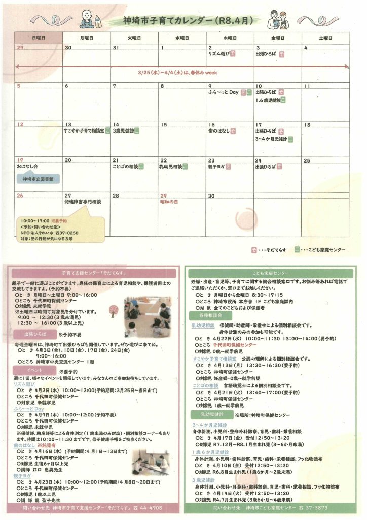 【子育てカレンダー・子育て支援のお知らせ】(R8.4月) 2026年03月26日 園だより・お知らせ (掲載のみ) 神埼市より 【子育てカレンダー・子育て支援のお知らせ】が ありましたので、お知らせ致します。 ★印刷はこちらから→ R8.4 古い記事へ 一覧へ 新しい記事へ